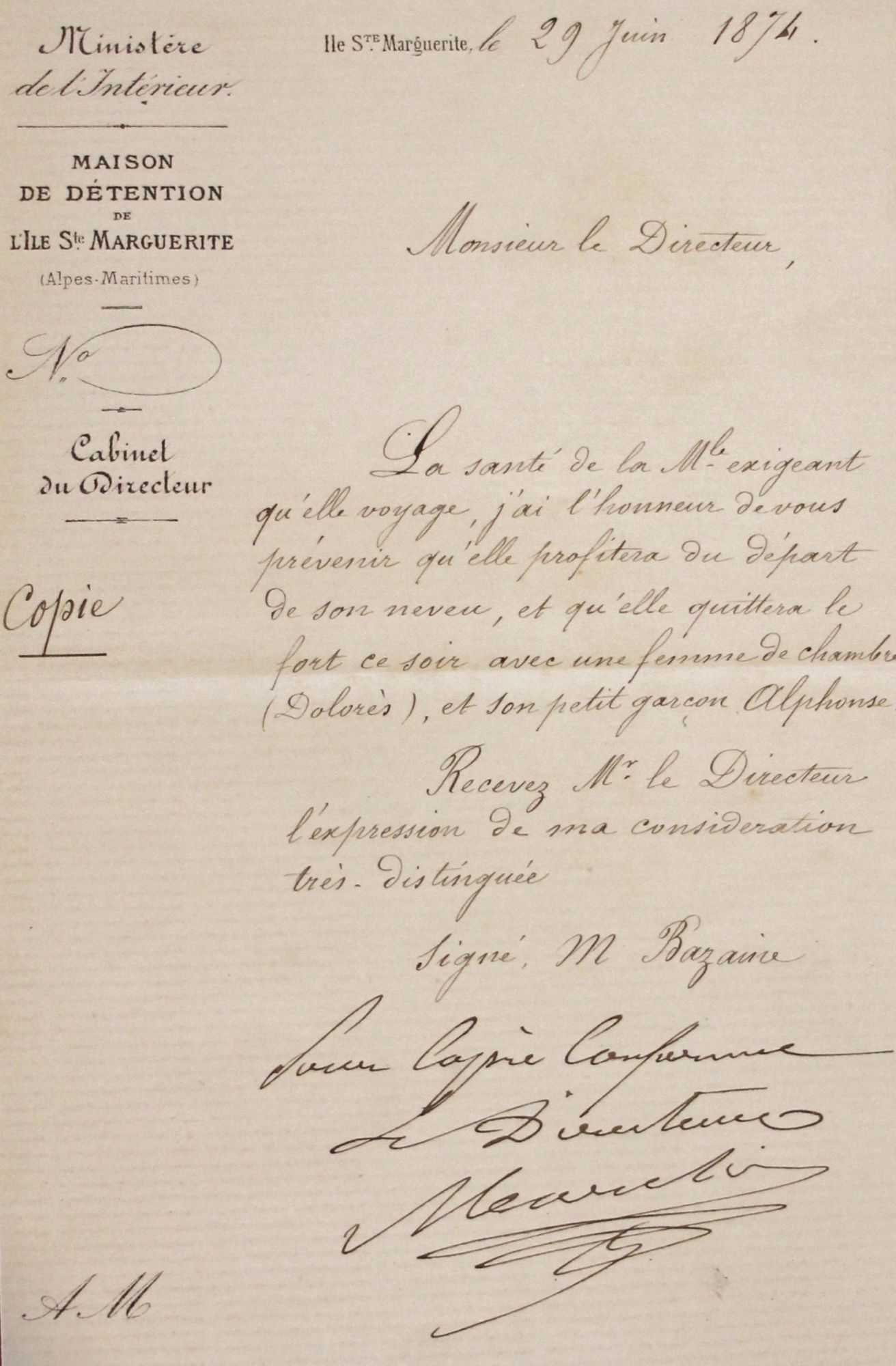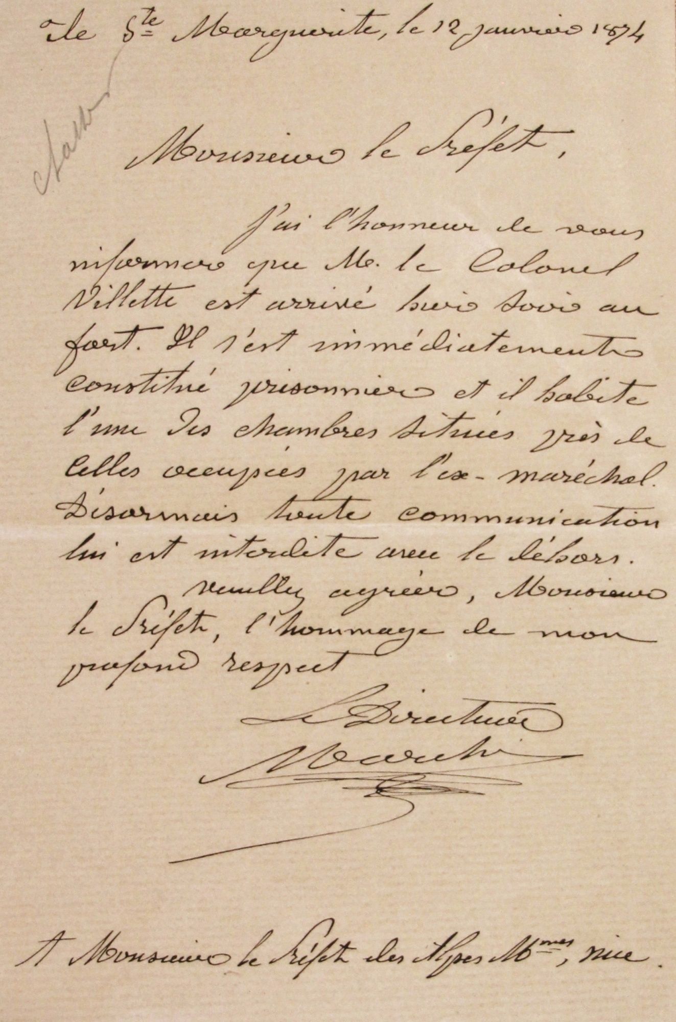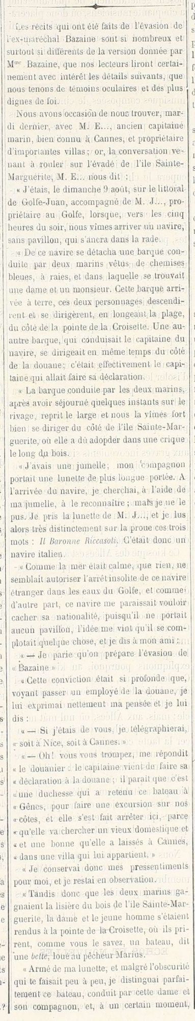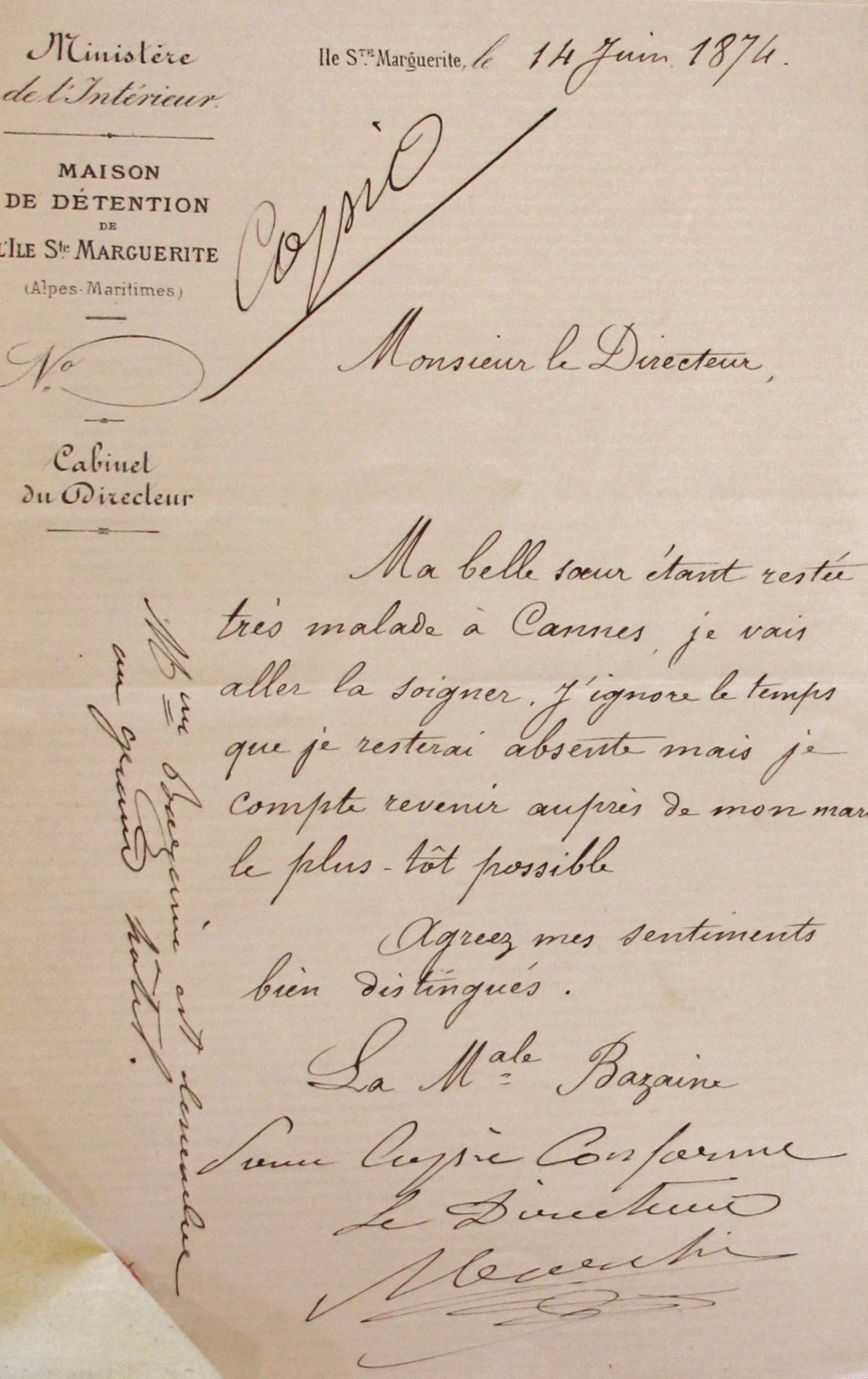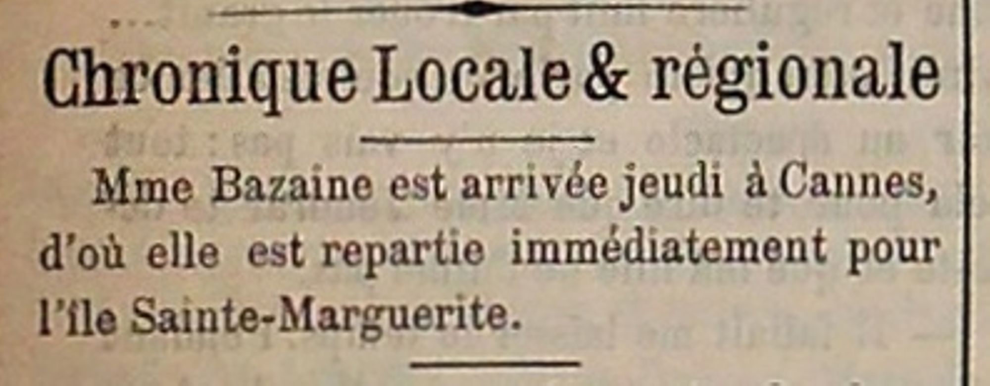 Le Maréchal François Achille Bazaine passé en conseil de guerre après la capitulation de Metz fut enfermé au fort de l'île Sainte-Marguerite et s'en évada d'une façon telle qu'elle est restée dans les Annales de l'histoire.