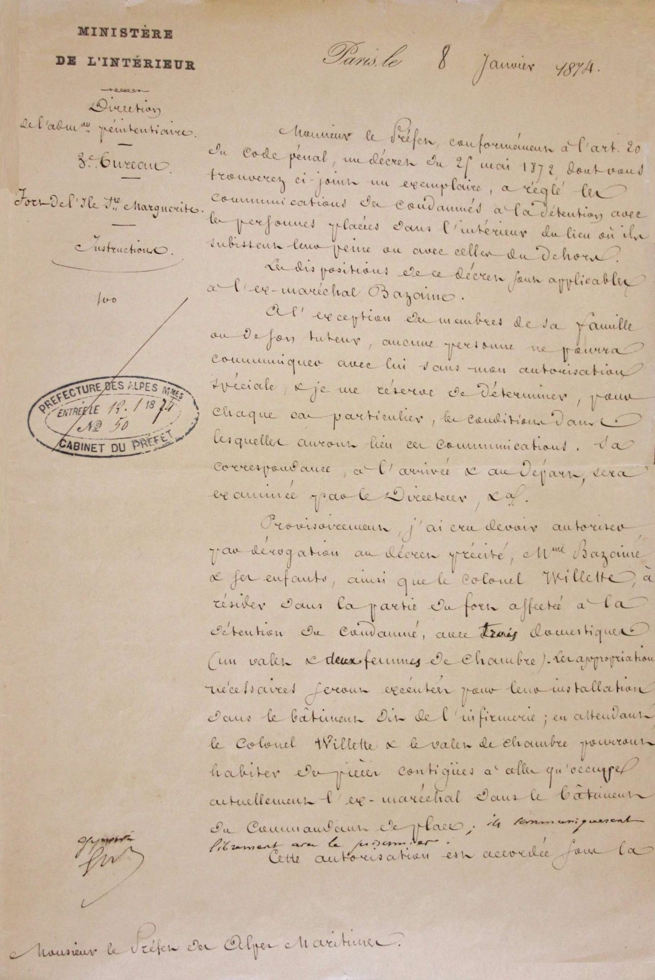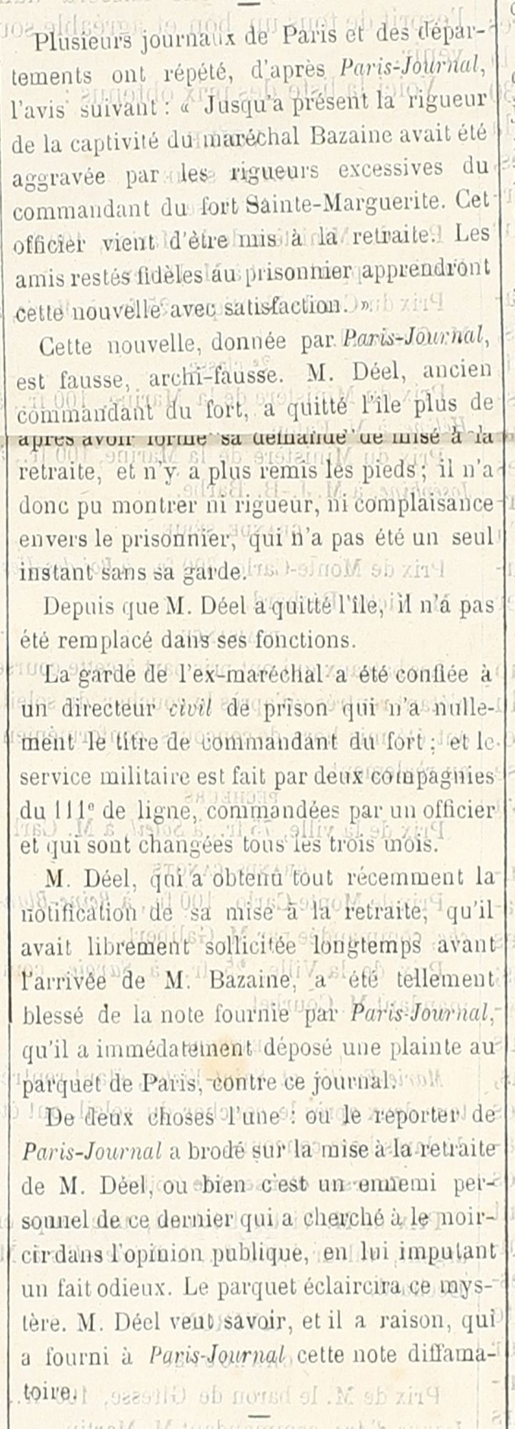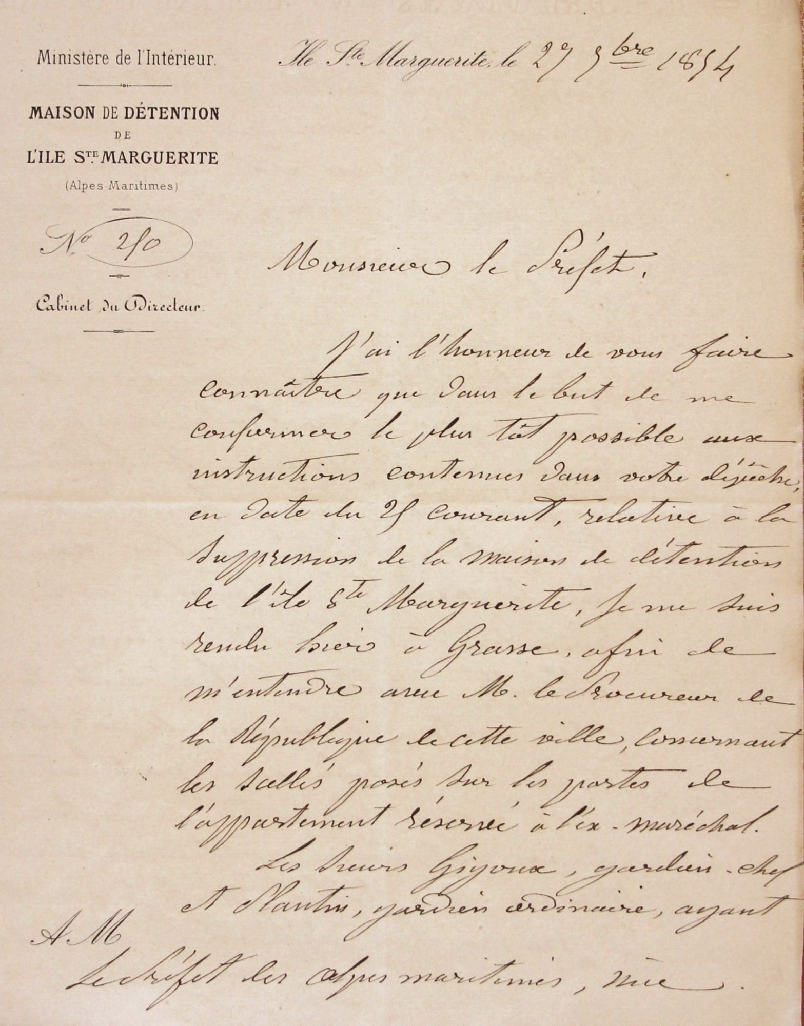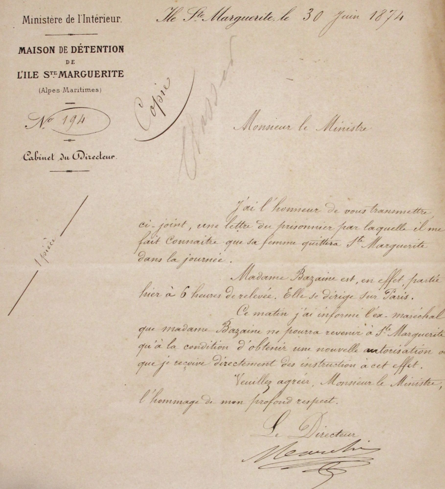 Le Maréchal François Achille Bazaine passé en conseil de guerre après la capitulation de Metz fut enfermé au fort de l'île Sainte-Marguerite et s'en évada d'une façon telle qu'elle est restée dans les Annales de l'histoire.