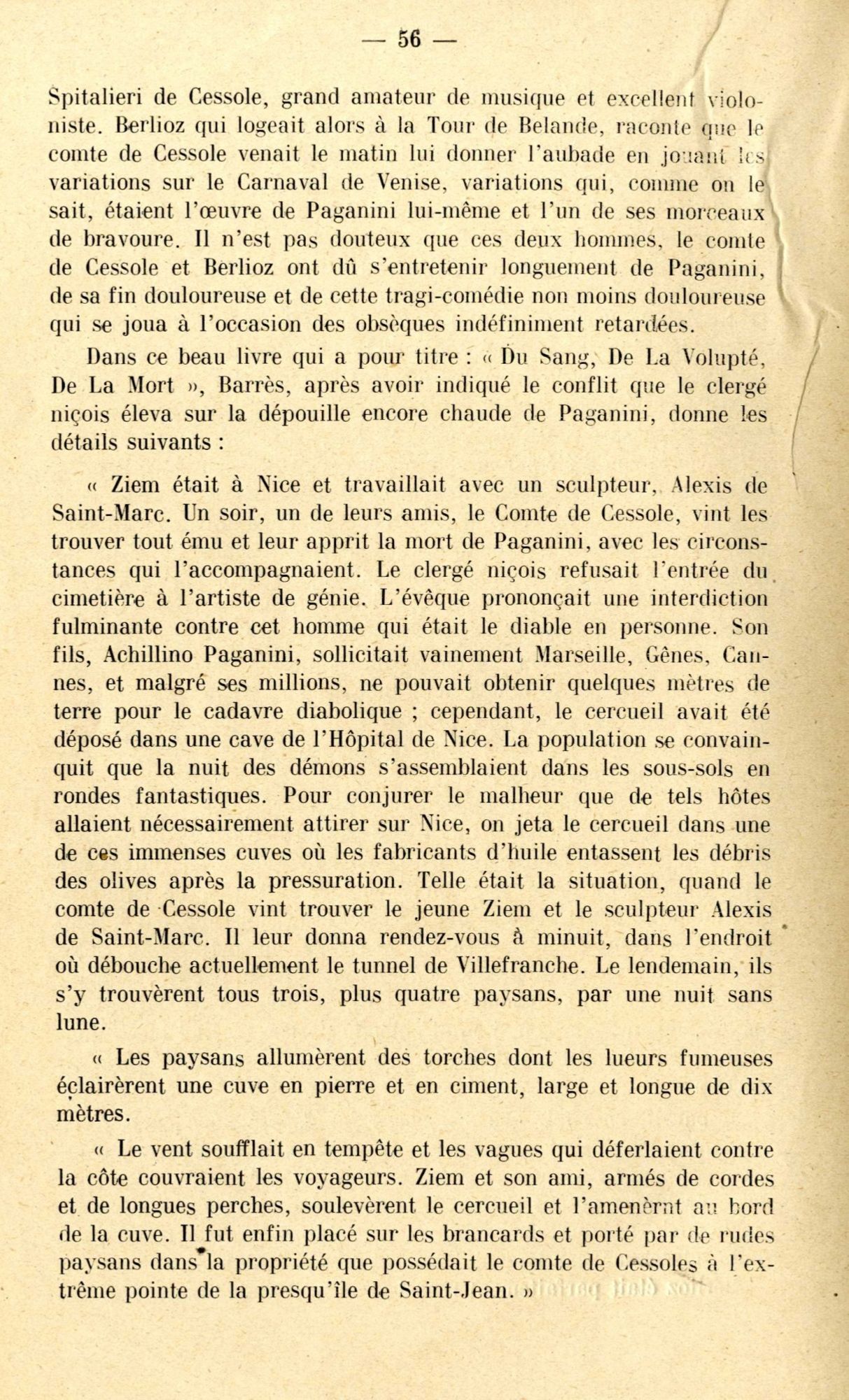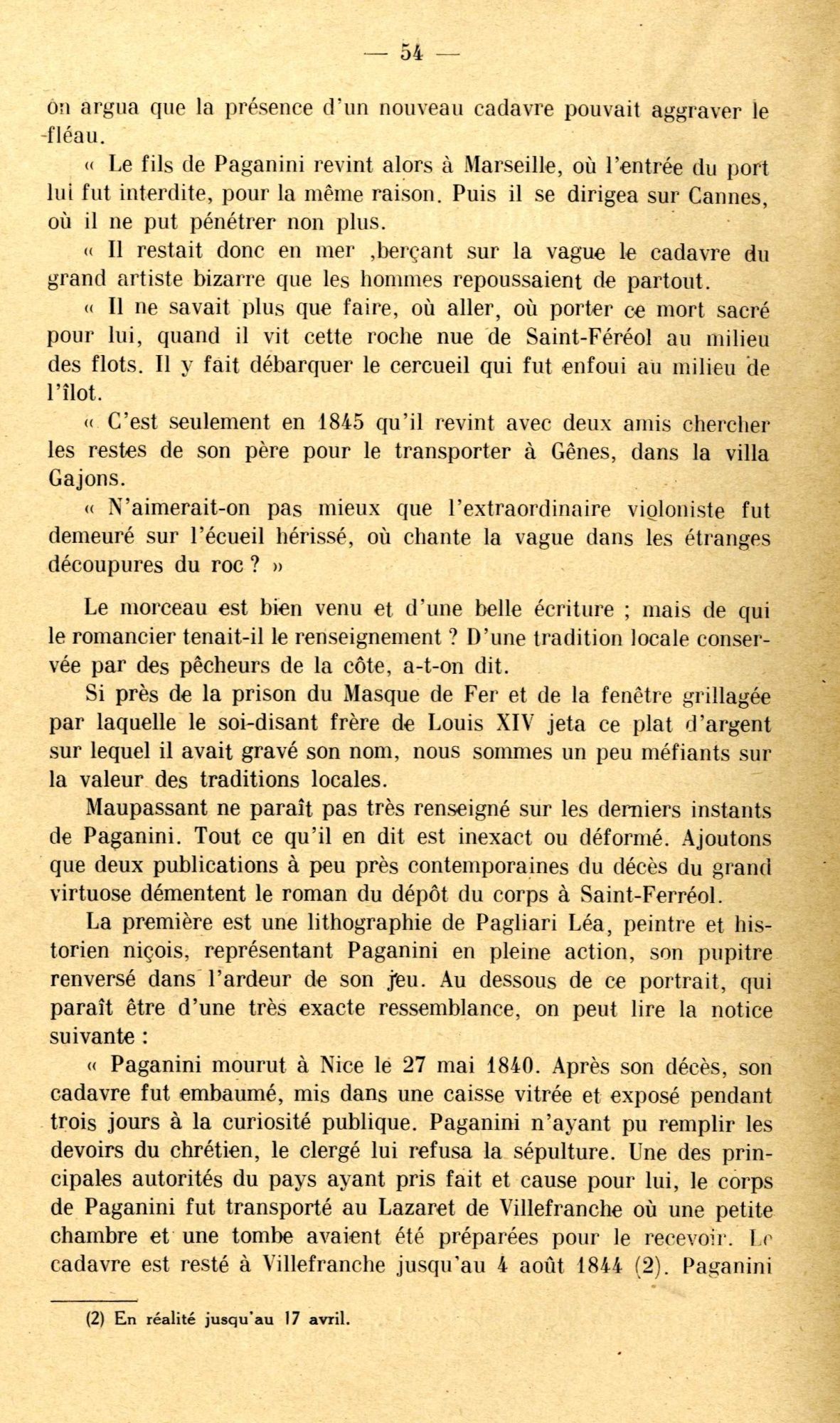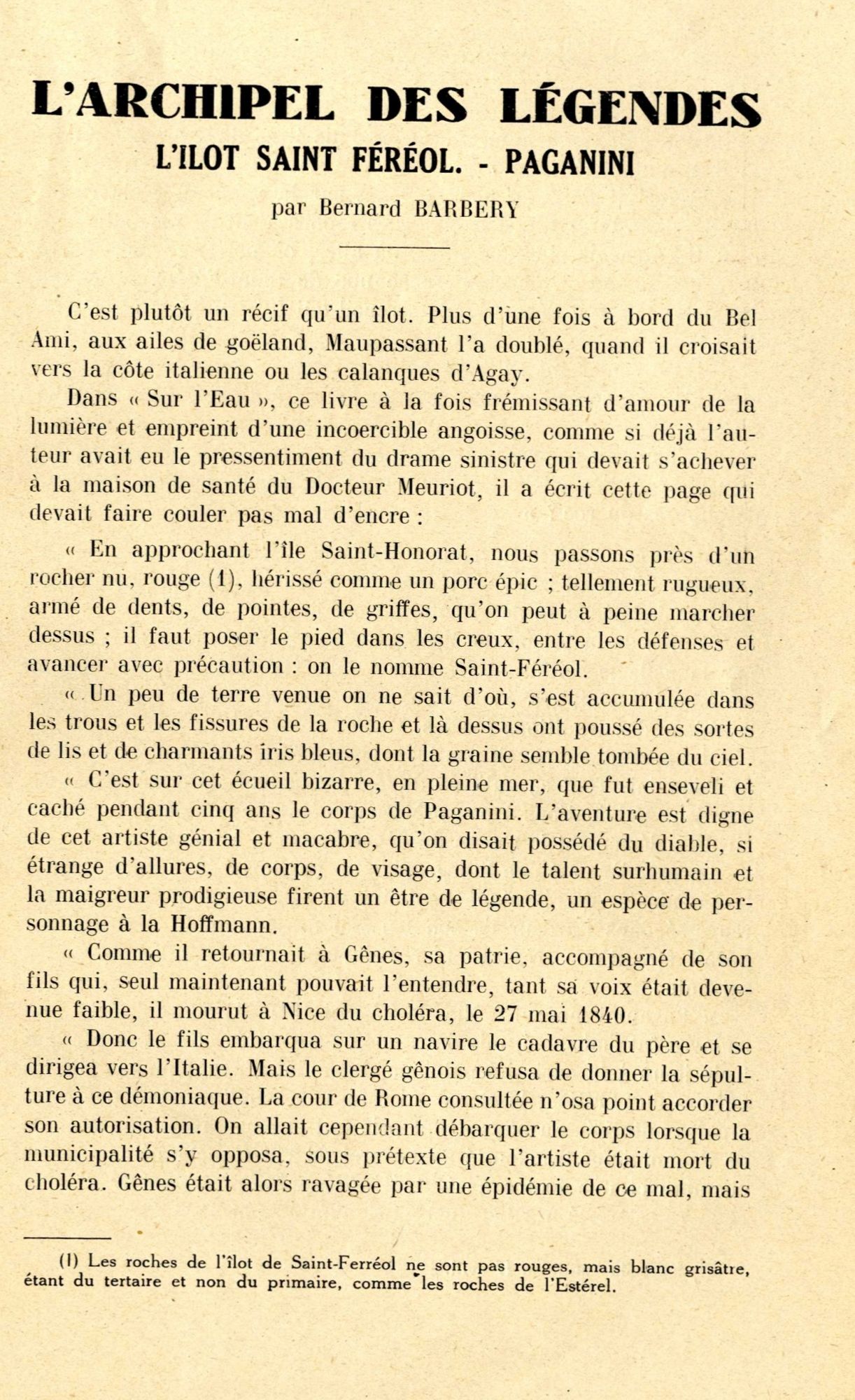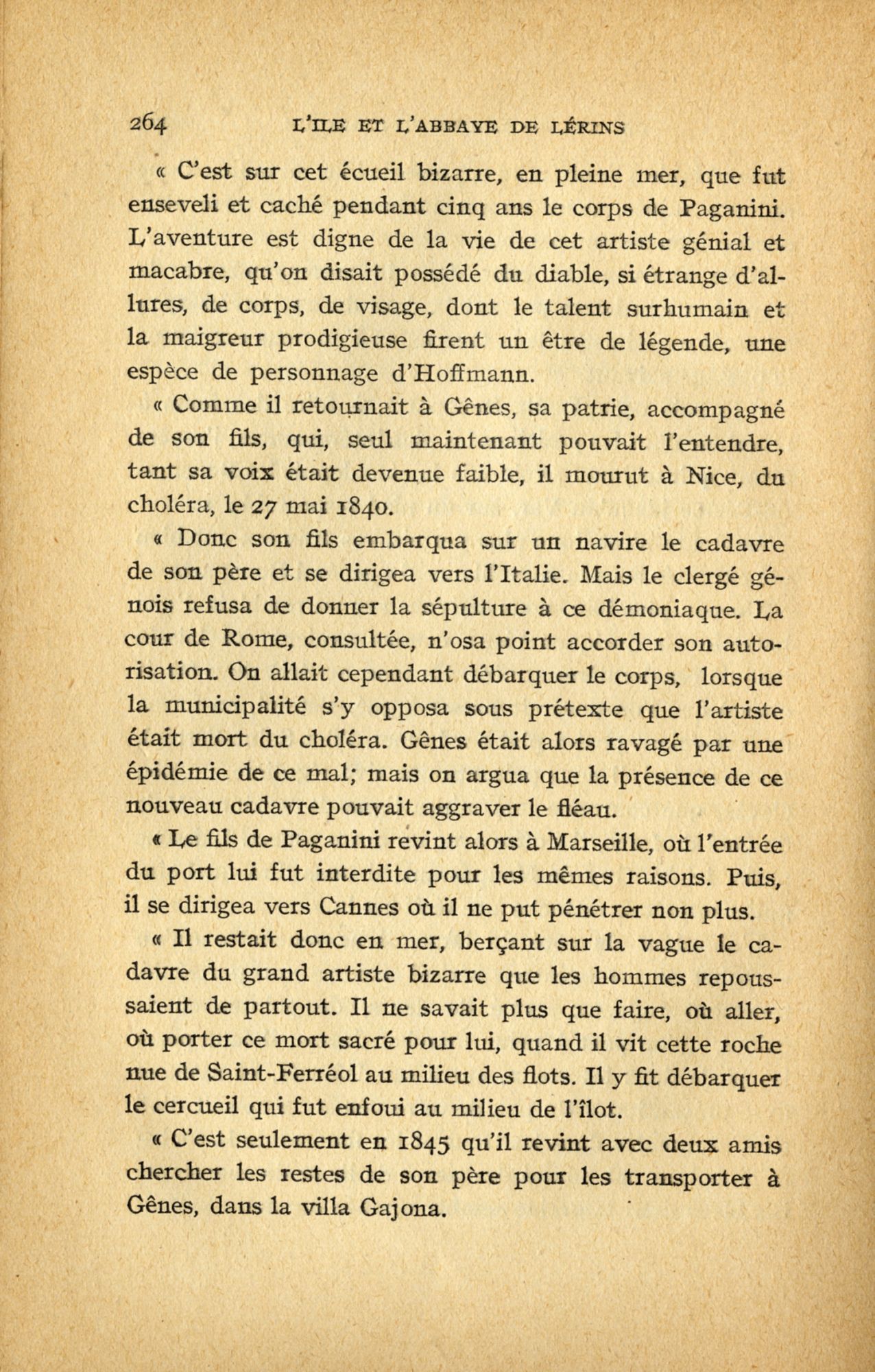 Est-ce ce fait qui a pu aider à la construction d'une légende qui concerne cette fois un célèbre musicien, né à Gênes : le corps de Paganini « mort du choléra » en mai 1840, aurait été « enfoui » dans l’îlot de Saint-Ferréol, pendant quatre ans, tous les cimetières de la Côte lui étant alors fermés !
