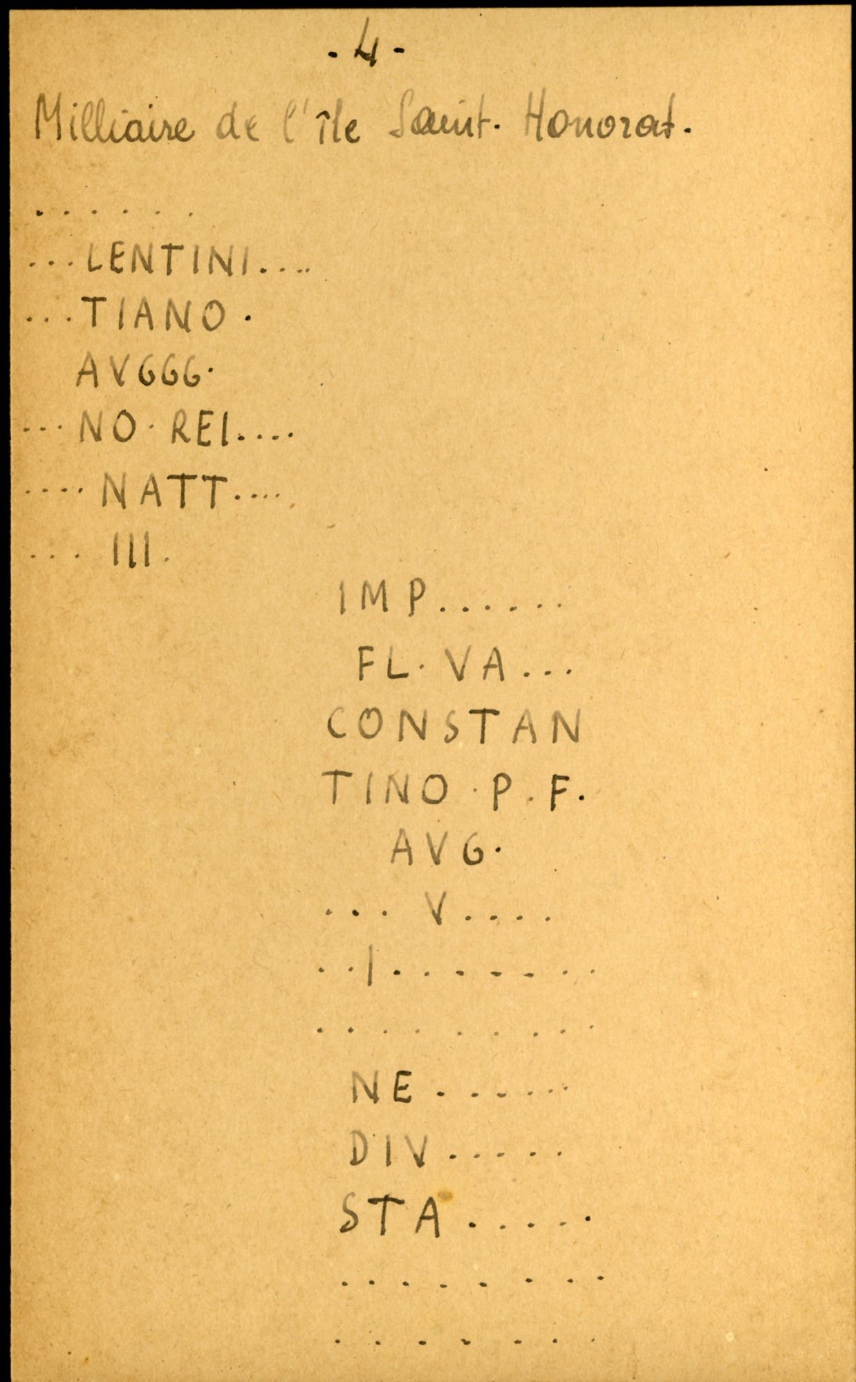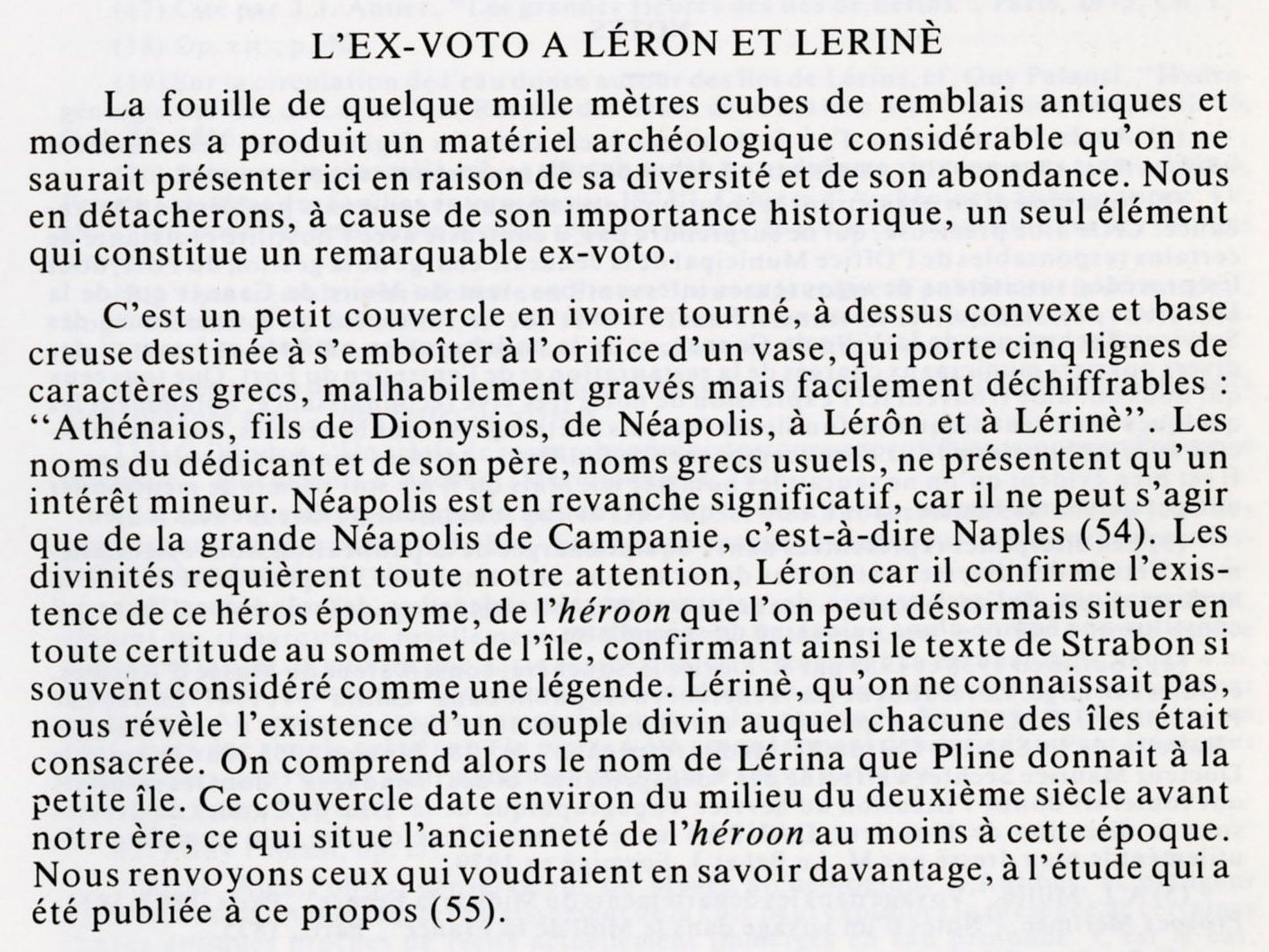 Cf. https://www.persee.fr/doc/ran_0557-7705_1982_num_15_1_1215 : Lérôn et Lériné aux îles de Lérins : un couvercle en ivoire, à dédicace grecque, découvert à l'île Sainte-Marguerite, article de G. Vindry et J. Coupry.