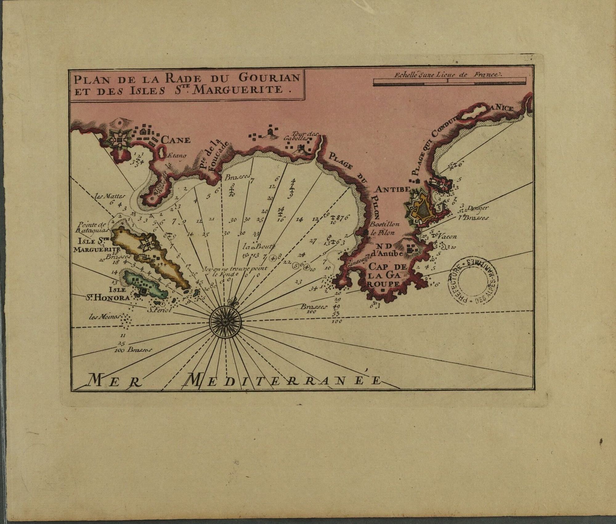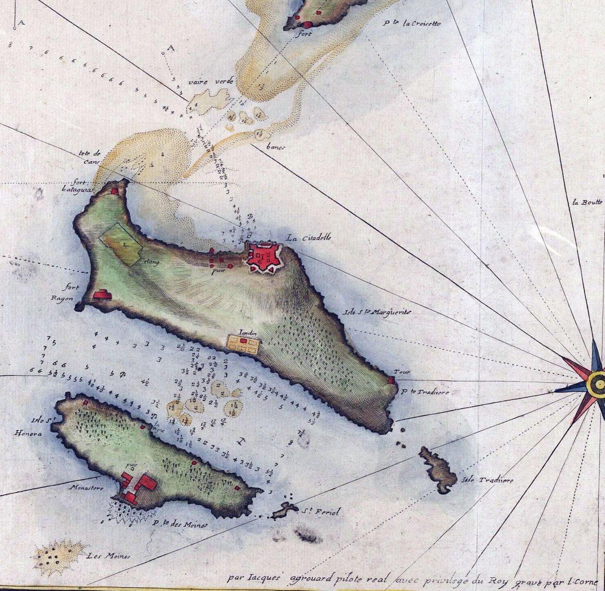 Ci-contre, partie du plan de Jacques Ayrouard, pilote real, gravure, vers 1746, cote Archives Départementales, 01Fi0035.
