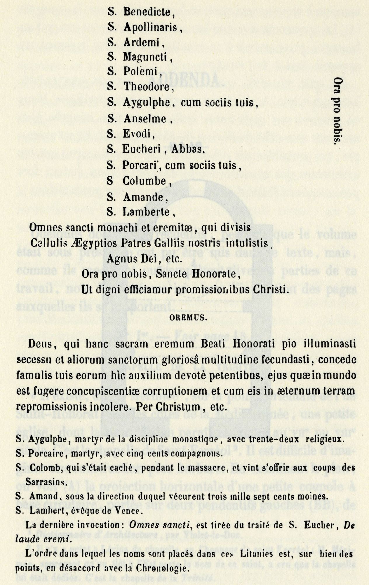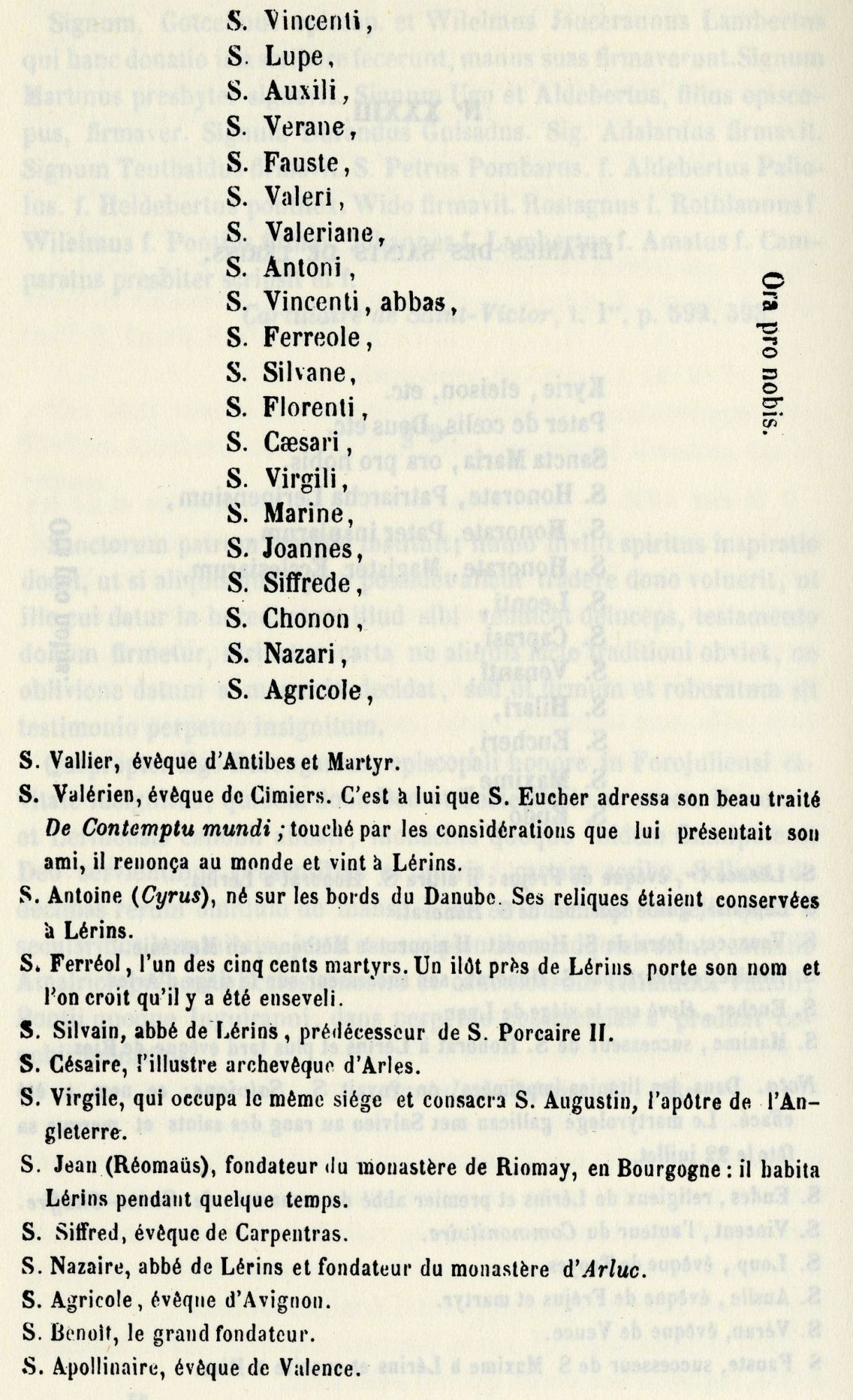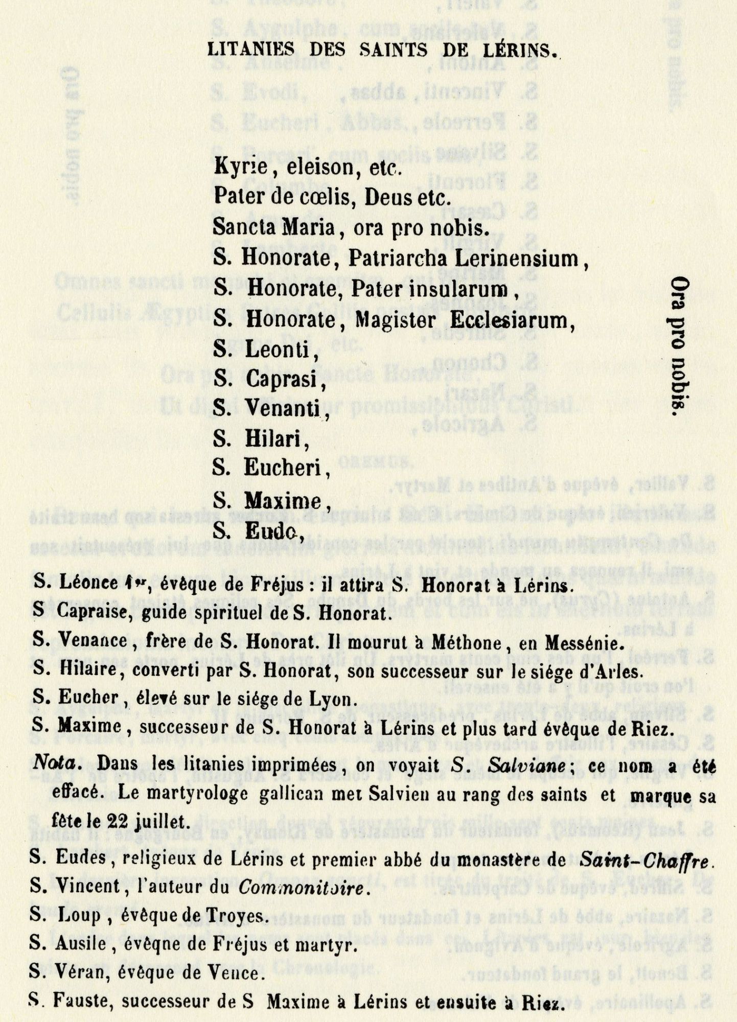En 1613, paraît à Lyon la CHRONOLOGIA LERINENSIS de Dom Vincent Barralis Salerne. Cet ouvrage en une seule édition est indispensable pour connaître l'histoire du monastère de Saint Honorat. Citons, sans être exhaustif, parmi les saints de Lérins : Honorat, Caprais(e), Léonce, Hilaire, Eucher, Maxime, Eude, Loup, Vincent, Salvien, Véran, Salonius, Auxile, Fauste, Valère, Antoine de Syrie, Sylvain, Ferréol, Théodore, Apollinaire, Cyprien, Virgile, Césaire, Florent, Agricole, Aigulph ou Aygulphe, Lambert, Jean Cassien, etc... Pour apprécier la vie des innombrables saints de Lérins, devenus évêques ou archevêques, vous pouvez consulter le Ms.23 "Abrégé de la vie des saints du célèbre monastère de Lérins et de tous les abbés qui ont gouverné iusque en l'année 1505, par dom Delisle prieur et religieux dudit célèbre monastère de Lérins." : http://www.bibliotheques.ville-grasse.fr:8080/pleade/ead.html?id=FRBMGCGM-B060696201-Ms&c=FRBMGCGM-B060696201-Ms_Ms.23&qid=sdx_q