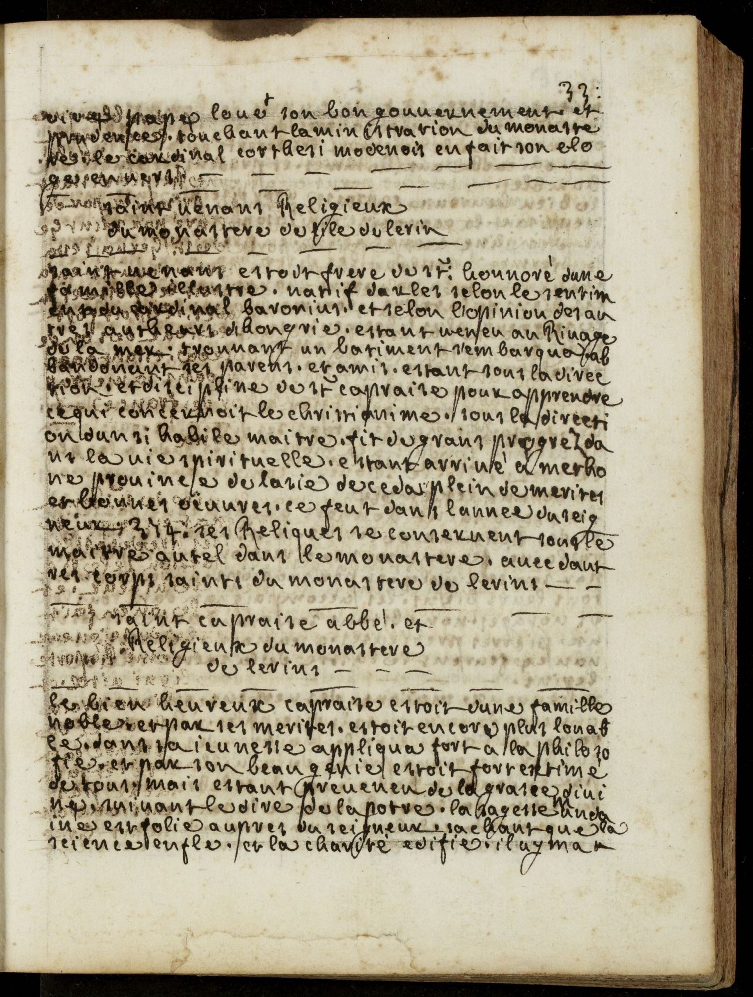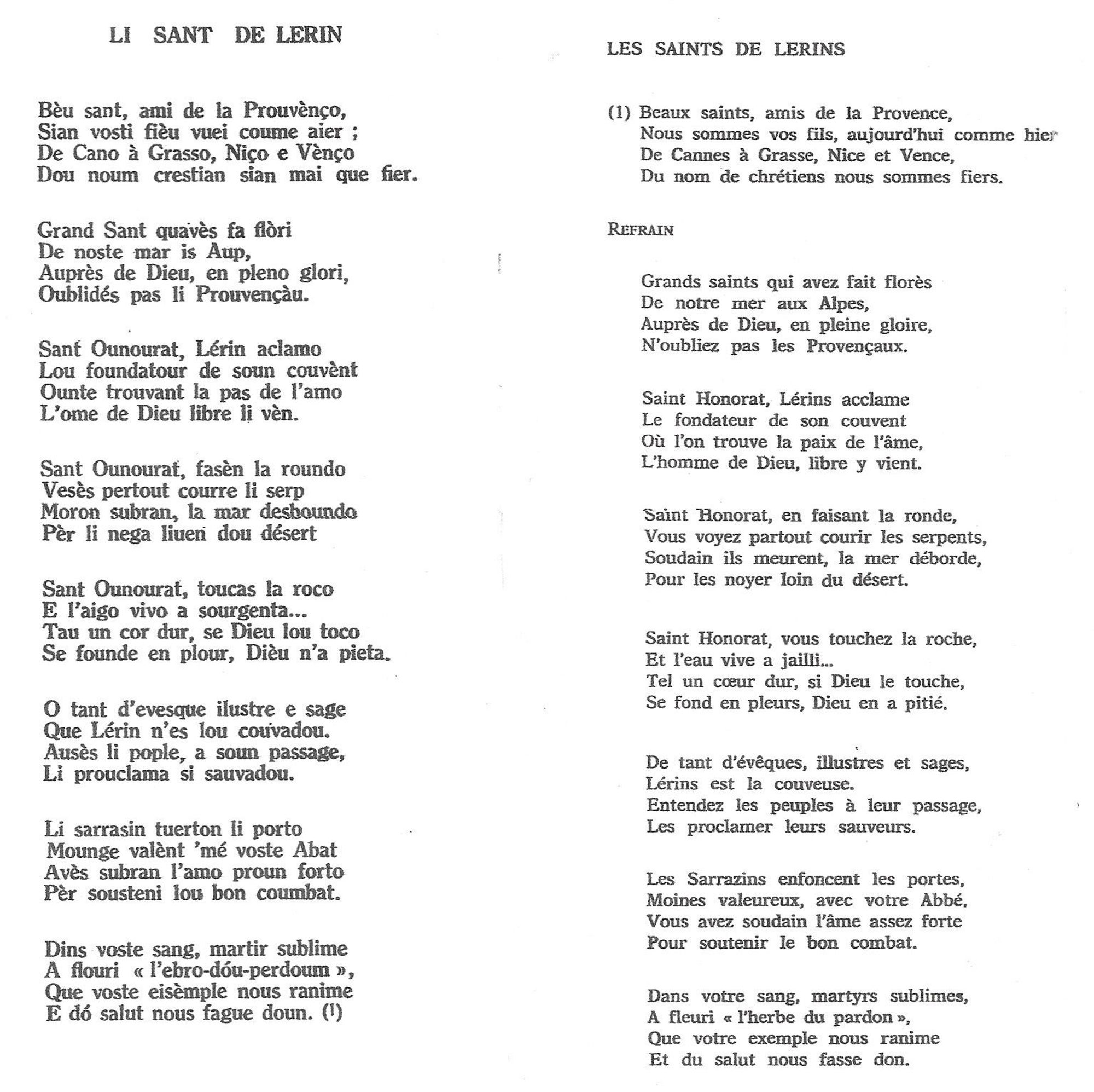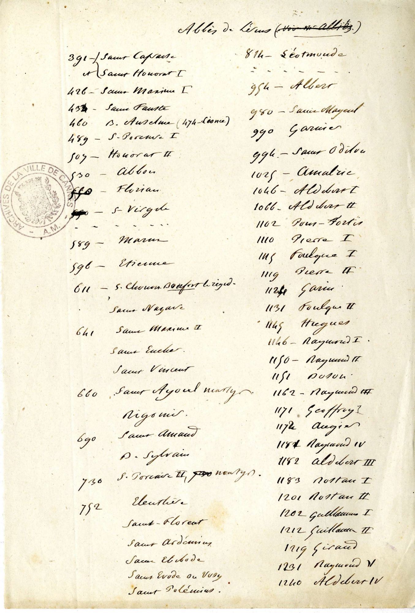 En 1613, paraît à Lyon la CHRONOLOGIA LERINENSIS de Dom Vincent Barralis Salerne. Cet ouvrage en une seule édition est indispensable pour connaître l'histoire du monastère de Saint Honorat. Citons, sans être exhaustif, parmi les saints de Lérins : Honorat, Caprais(e), Léonce, Hilaire, Eucher, Maxime, Eude, Loup, Vincent, Salvien, Véran, Salonius, Auxile, Fauste, Valère, Antoine de Syrie, Sylvain, Ferréol, Théodore, Apollinaire, Cyprien, Virgile, Césaire, Florent, Agricole, Aigulph ou Aygulphe, Lambert, Jean Cassien, etc... Pour apprécier la vie des innombrables saints de Lérins, devenus évêques ou archevêques, vous pouvez consulter le Ms.23 "Abrégé de la vie des saints du célèbre monastère de Lérins et de tous les abbés qui ont gouverné iusque en l'année 1505, par dom Delisle prieur et religieux dudit célèbre monastère de Lérins." : http://www.bibliotheques.ville-grasse.fr:8080/pleade/ead.html?id=FRBMGCGM-B060696201-Ms&c=FRBMGCGM-B060696201-Ms_Ms.23&qid=sdx_q