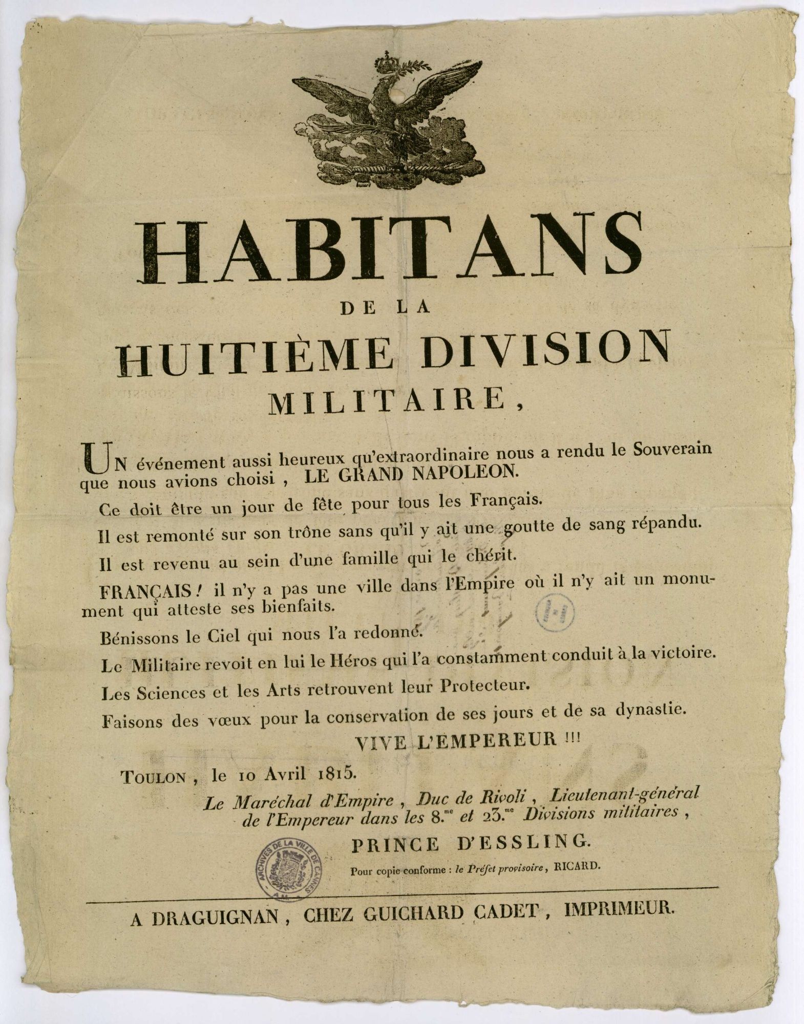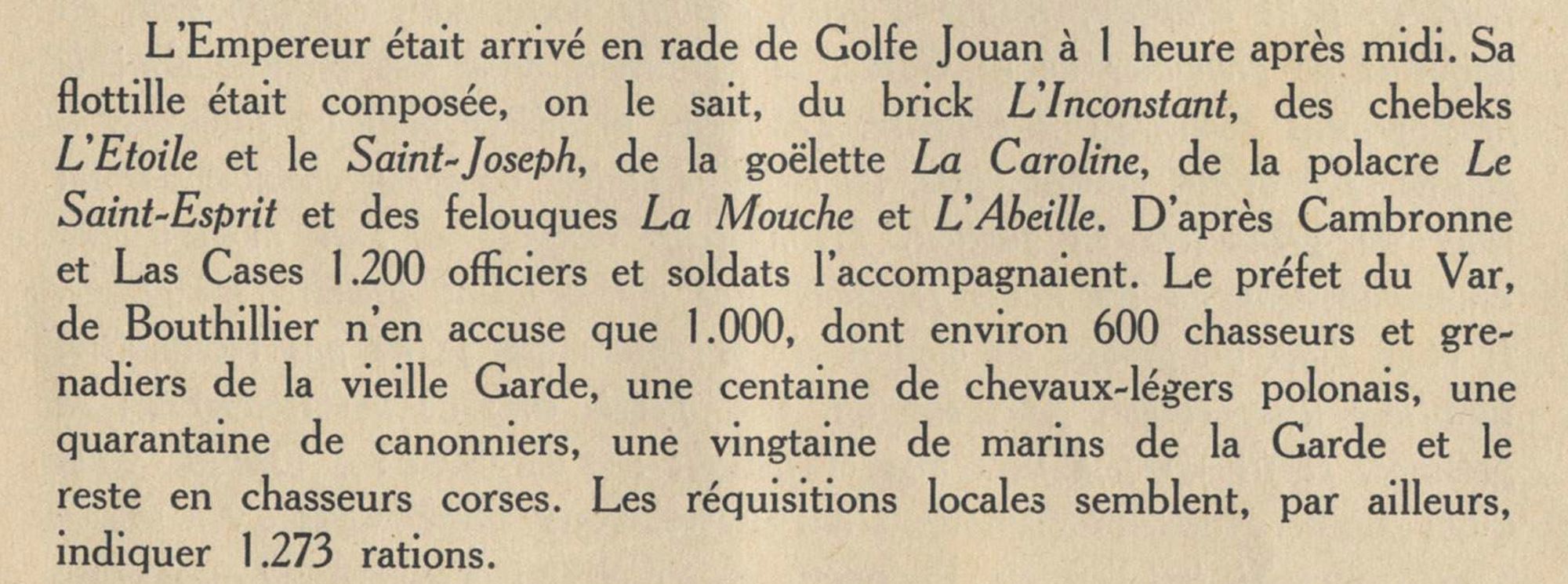 Le 26 février 1815, Napoléon embarque à bord de l’Inconstant avec son Etat-major et une partie de ses hommes, soit un peu plus de 1200 soldats. La flotte est composée de 7 navires. Ils appareillent vers minuit pour rejoindre Saint-Raphaël. Cependant, en fin de matinée le 1er mars 1815, Napoléon et ses hommes débarquent en rade de Golfe-Juan, à la vue de tous, et notamment des douaniers.