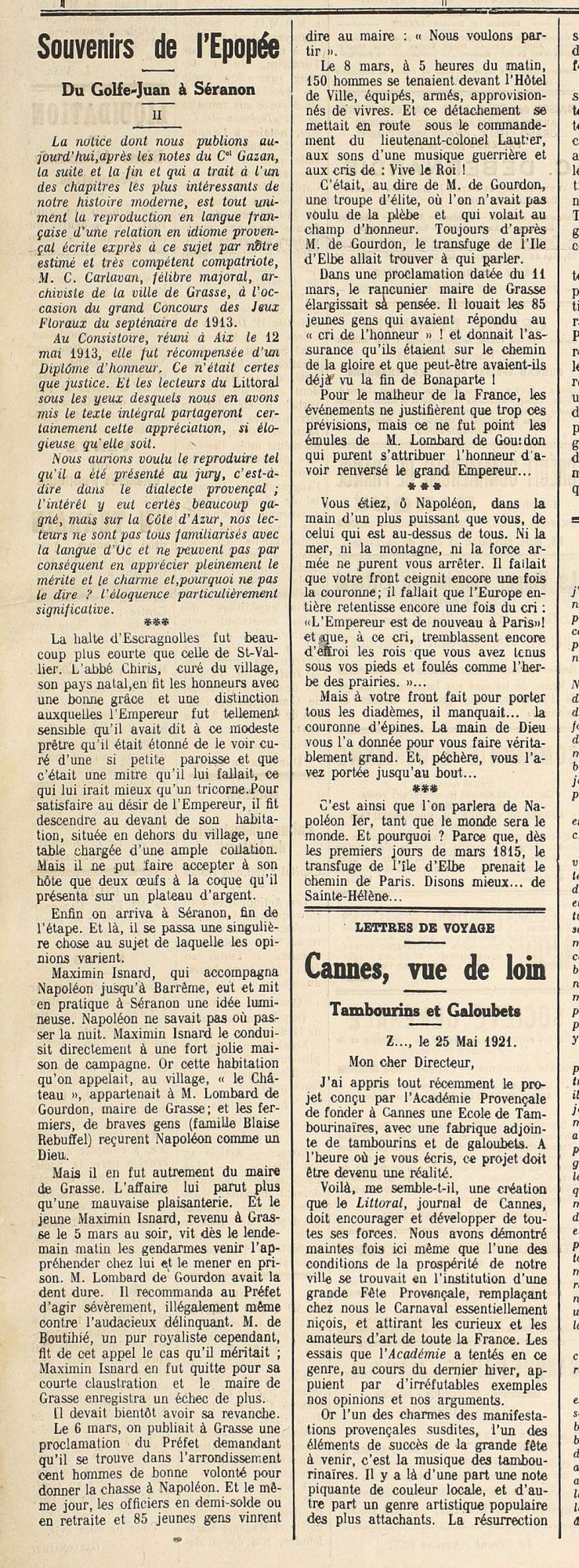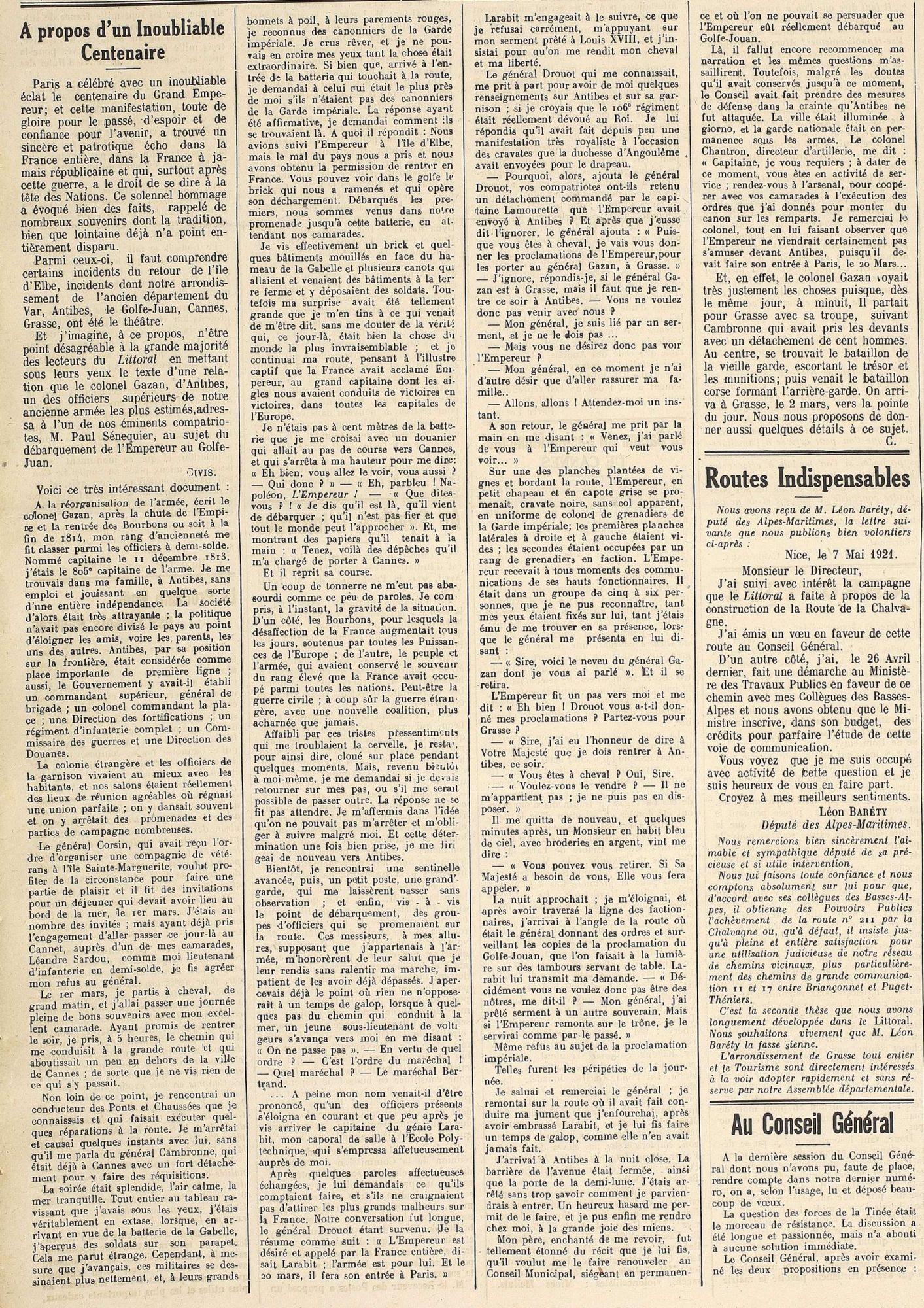 Napoléon débarque à Golfe-Juan le 1er mars 1815, et part accompagné d’une poignée de fidèles reconquérir le pouvoir. N'ayant pas obtenu de passeport pour rejoindre Paris en passant par Marseille, il choisit de passer par les montagnes en évitant la résistance de villes royalistes.