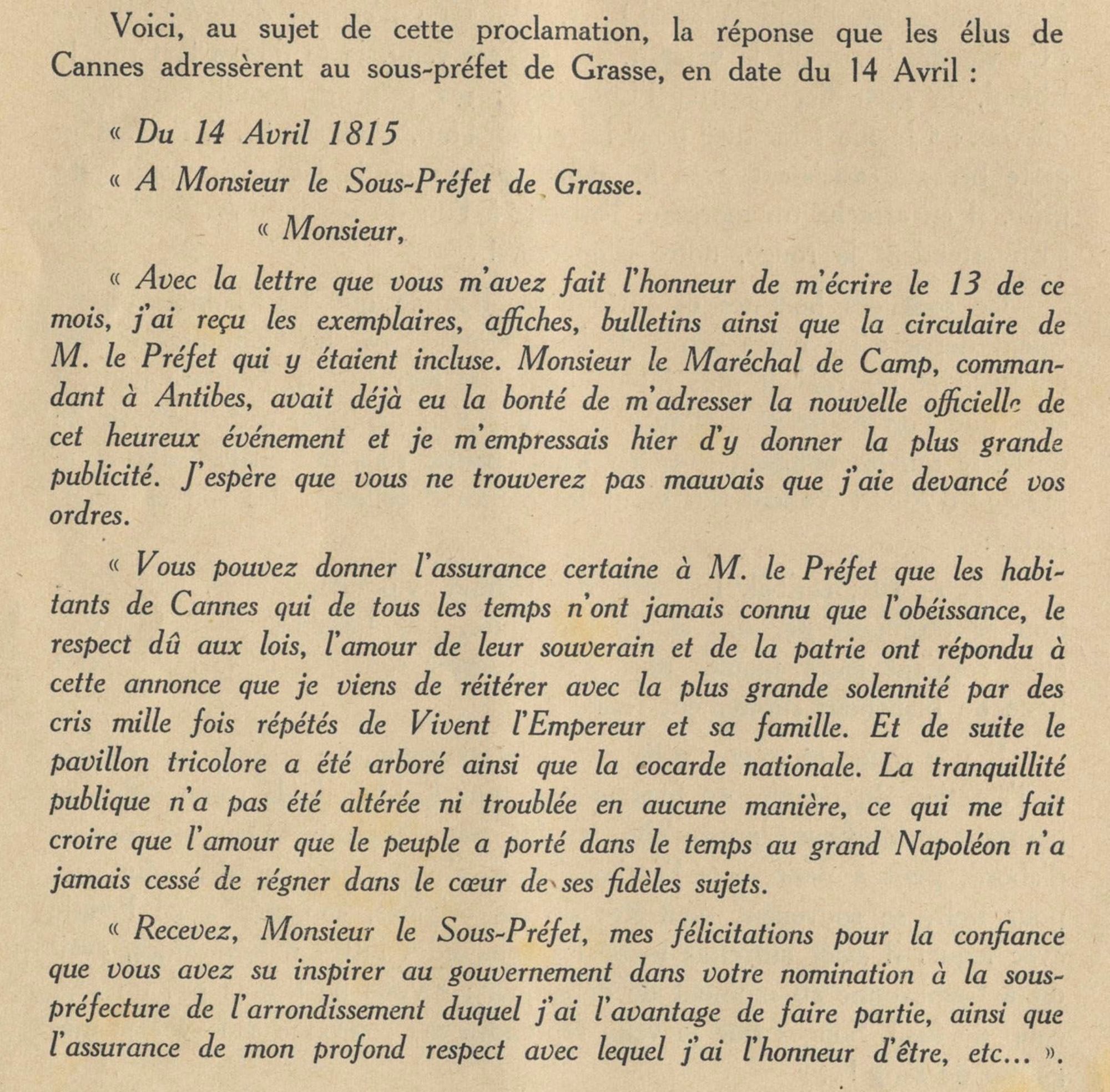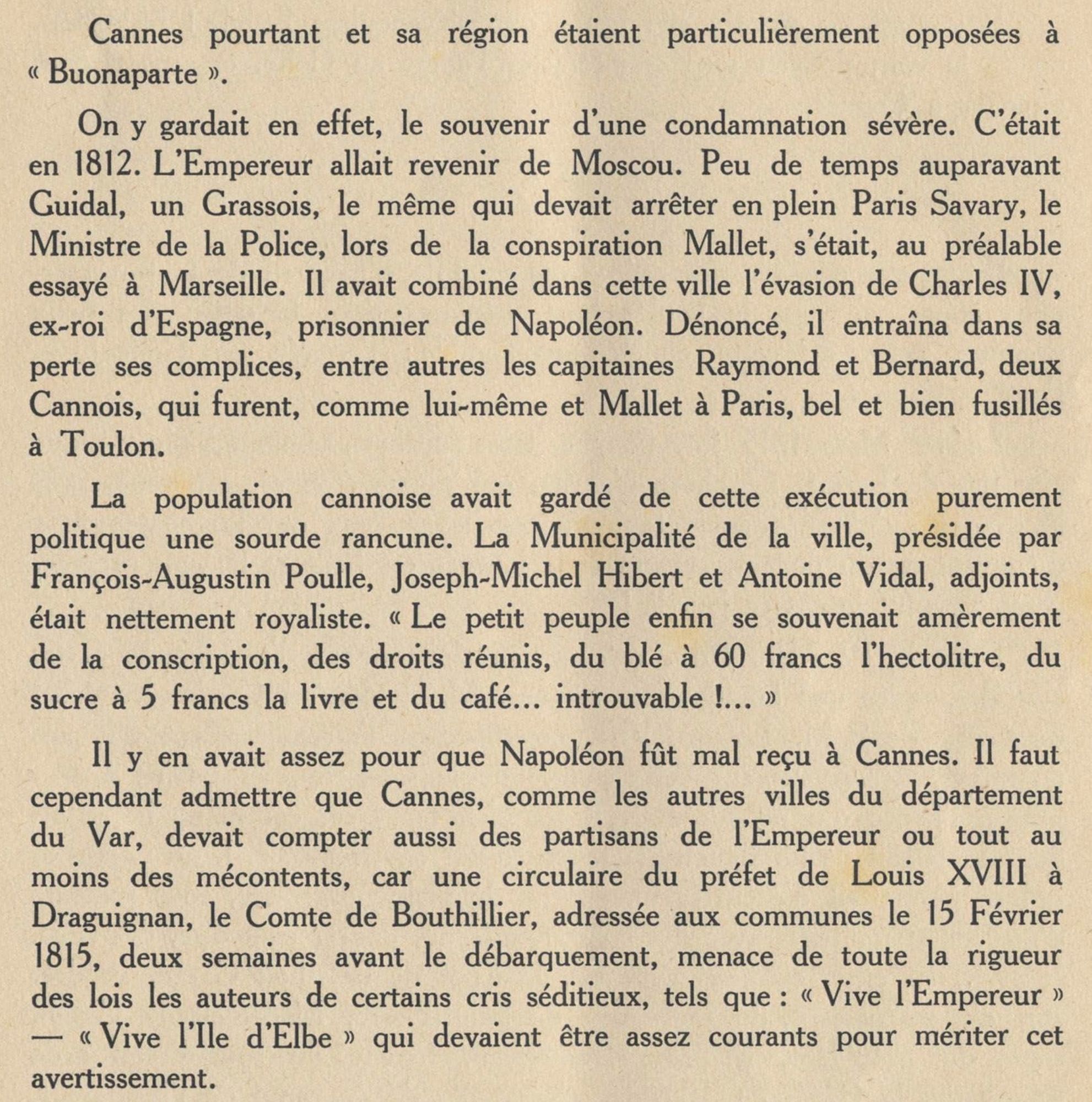 D’une part, Monsieur Poulle qui sera incarcéré à Antibes du 6 au 29 avril 1815, avec deux de ses adjoints, pour avoir trop bien suivi les ordres du sous-préfet en arrêtant le général Abbé, circulant sans passeport. D’autre part, Monsieur Hibert qui se montre soudainement fervent bonapartiste et parvient à se faire élire maire. Les émeutiers, animés par les deux partis, s’affrontent physiquement les 6 avril et 7 mai 1815, provoquant l’intervention de l’armée pour faire cesser les troubles. Après la défaite de Waterloo, le 18 juin 1815, M. Poulle est rétabli maire le 7 juillet 1815. Il donne sa démission le 24 juillet 1815. Le 26 juillet 1815, le Préfet du Var nomme M. Hibert en remplacement.
