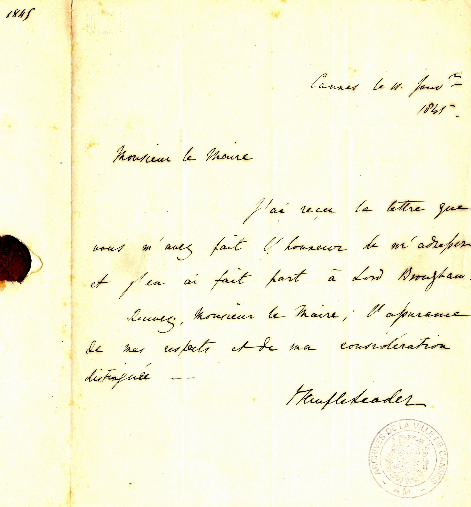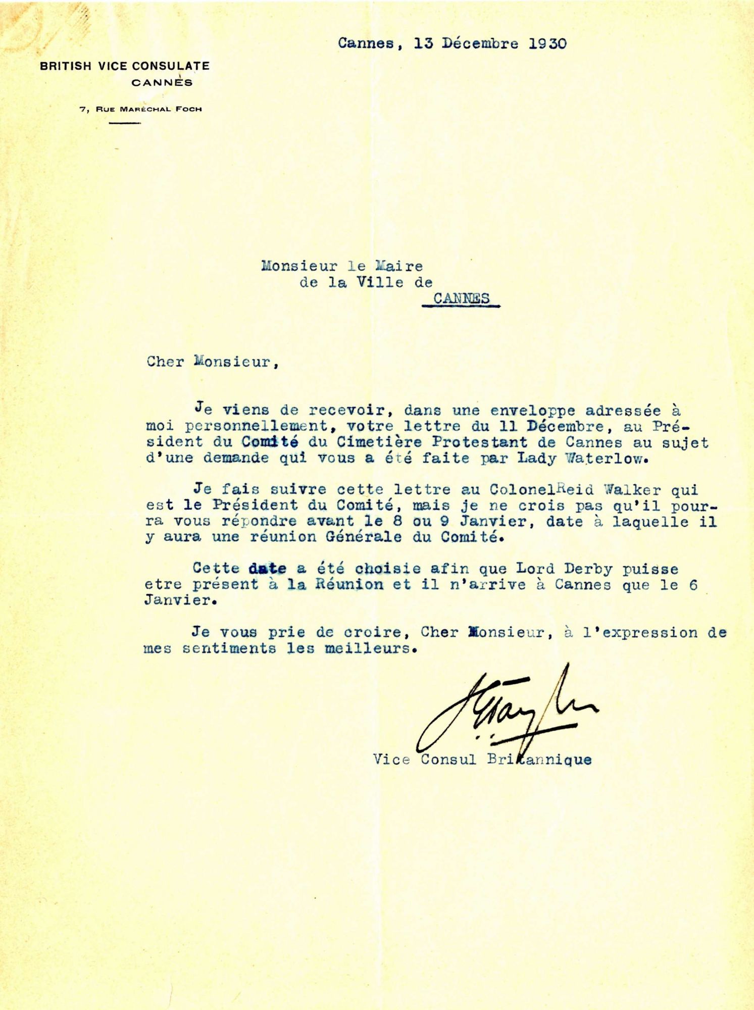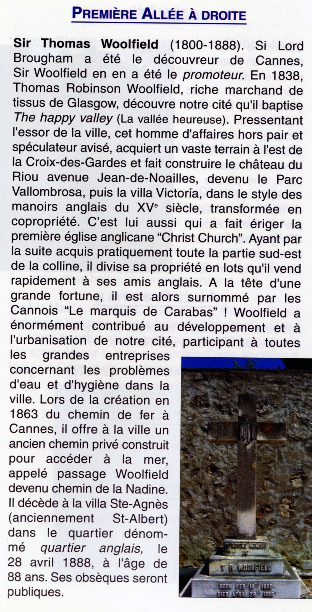 Sir Thomas R. Woolfield (1800-1888) a-t-il simplement suivi Lord Brougham, comme beaucoup d'autres ? Il résida dans une villa, dite Victoria. Ils se connaissaient bien puisque nous détenons une correspondance échangée entre ces deux personnages, ainsi qu'avec un autre hivernant, Sir J. Temple Leader. Lord Woolfield aurait dit : "Au cours de 7 ans de voyage, en Espagne, en Egypte, en Palestine, en Syrie, en Asie Mineure, en Turquie et en Grèce, à la recherche d'un coin où passer mes derniers jours, je n'avais rien trouvé qui me séduisit autant que Cannes."