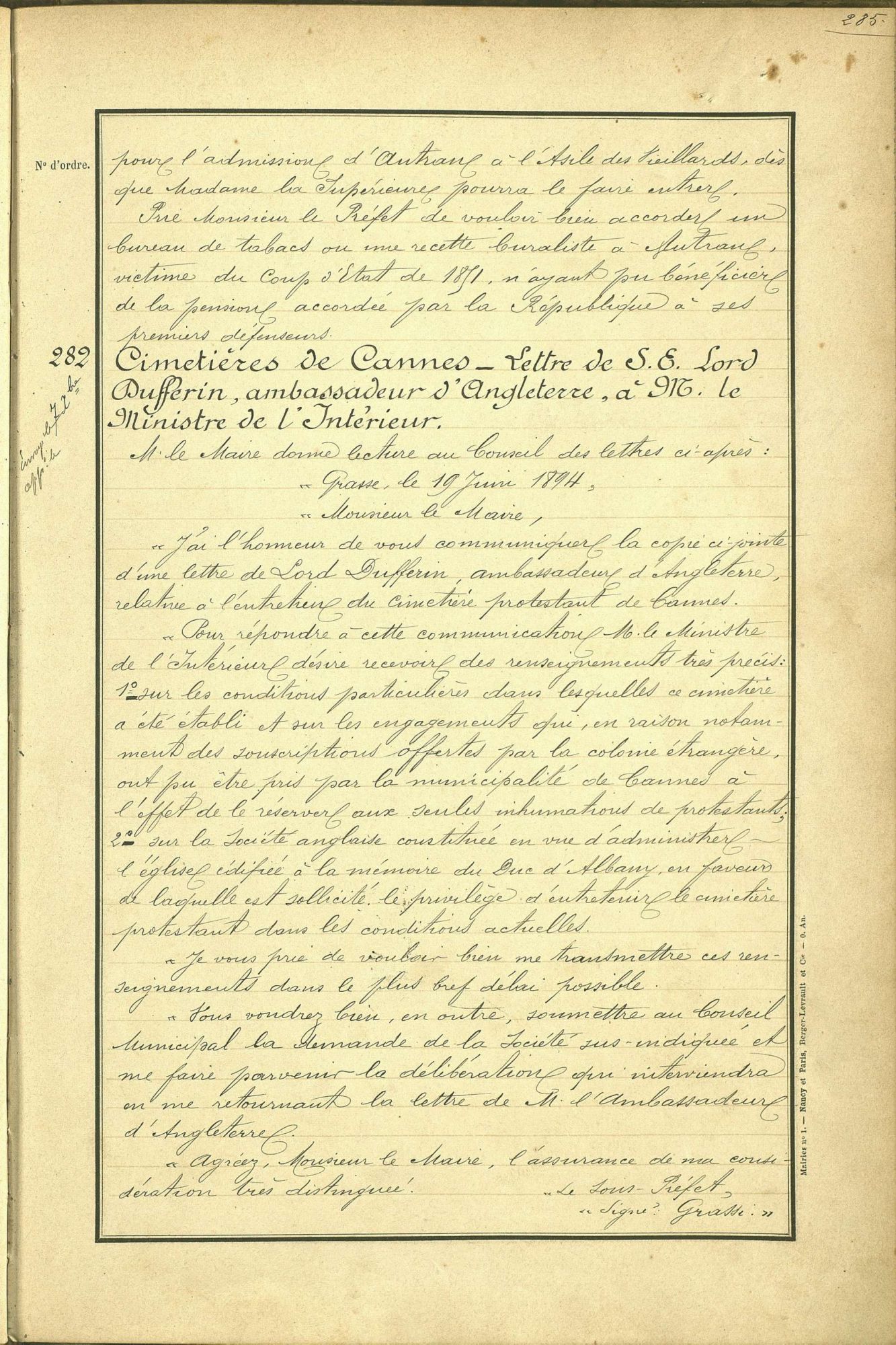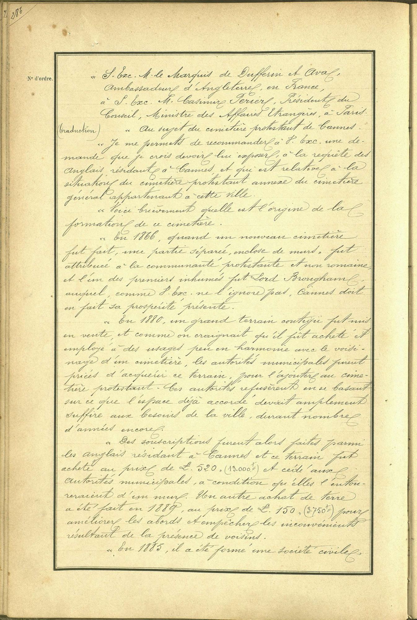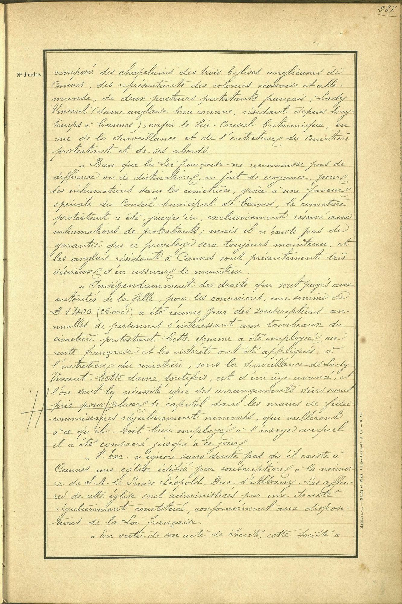 La création d'un cimetière dédié aux protestants, réclamé par les membres de la colonie anglaise, sera approuvée par une longue délibération du conseil municipal le 8 novembre 1894.